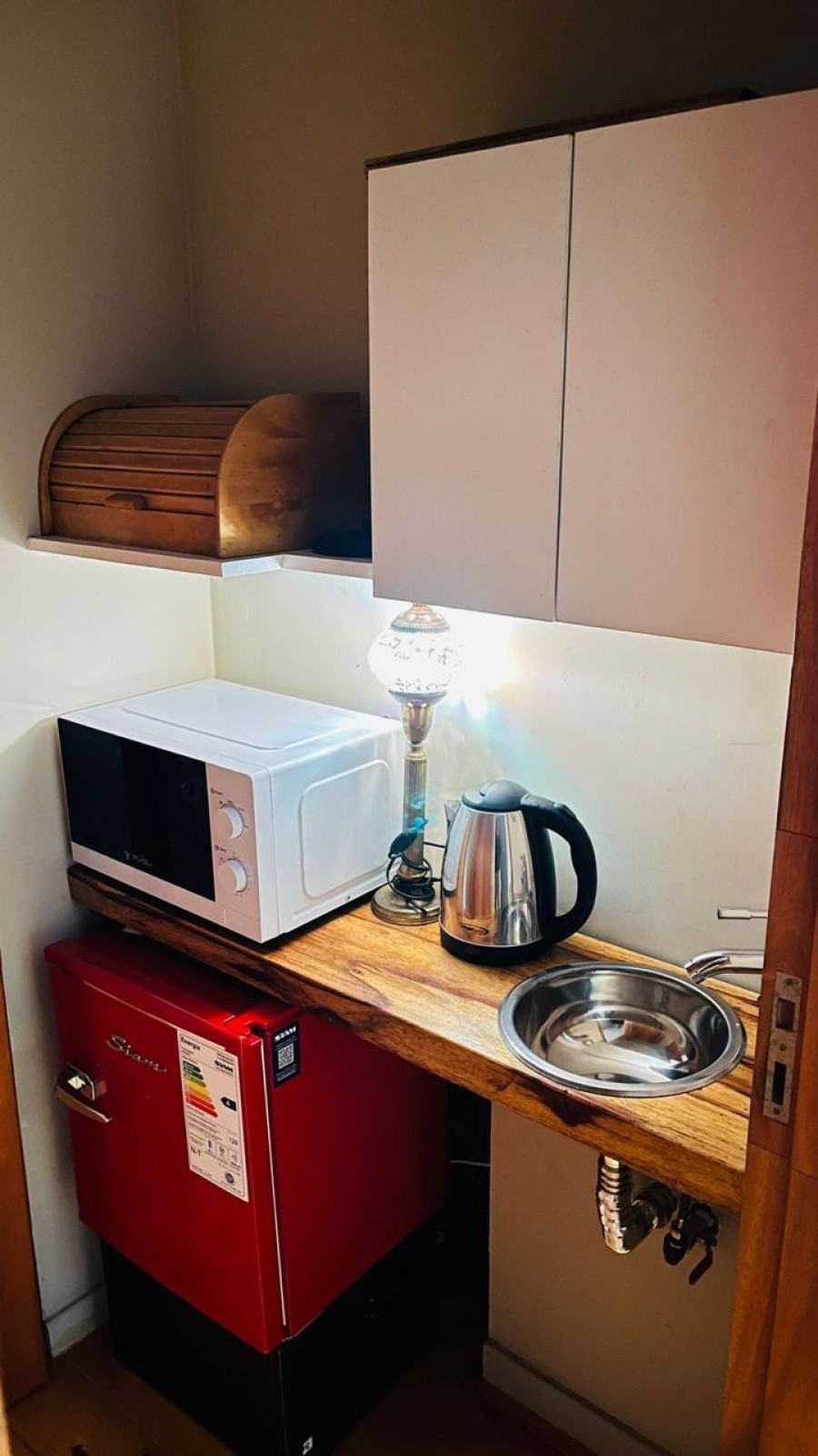 - ?kitchenette con frigobar, mesada de madera, bacha de acero inoxidable, grifería monocomando y alacena de guardado